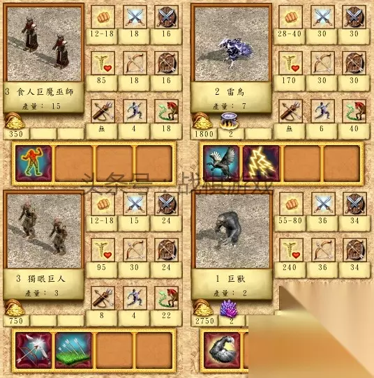 1级兵狂暴战士:属性爆强。两连击特技更是敌人的噩梦。就是狂暴特技导致无法控制走位。就算到了后期,一定数量的狂暴战士也非常凶猛。这是不是暗示着没脑子的人,都战斗力很强,哈哈。特技:两连击。特技:狂暴。战斗中不受玩家控制,自己独立行动,不会等待。并且不受恐惧类效果(包括骨龙的“引起恐惧”技能、梦魇兽和黑骑的恐惧魔法,还有恐惧结界魔法以及相关宝物)影响 1级兵人头马:属性在1级兵里逆天。但出于平衡的考虑,产量实在是感天动地,这种产量放2级兵里比较,都快最低了。特技:远程攻击。特技:肉搏伤害不减特技:短程射击。射程超过20,伤害减半,如果超过40,伤害会减为原来的1/4。对于近处的敌人,狠狠射击。对于近身的敌人猛砍就行了。远处的敌人嘛。。。还是走过去吧。如果搭配精准魔法,远程表现会好很多。然而。。大多数情况下都没有。。。 2级兵游牧民族:流浪了好久,终于有一个种族肯收留了。属性不错。比较肉,输出过得去。搭配狂暴战士很舒适。狂暴战士一阵猛冲猛砍,游民民族后面补刀。特技:抢先攻击。相当不错。 2级兵人面鸟:特技较强,导致属性下降的很厉害。其实就是3代地下城的鹰身女巫。还是老问题,输出偏低。而且前置建筑太贵了,不推荐。特技:飞行。特技:不受反击。特技:攻击后返回。攻击敌人后自动飞回原位。2级兵总结:95%选游牧民族。人面鸟只在很少的特定局面里有用。可以完成一些常规完全无法完成的操作,但这种基本都是变态地图里才有意义,常规对战没什么用。