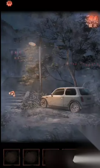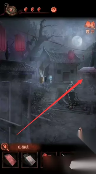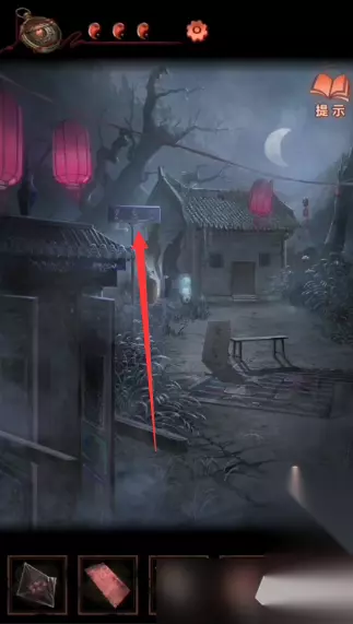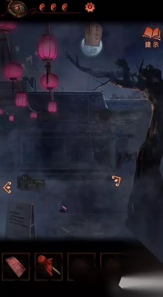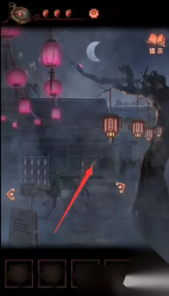 15、在第一个场景的下面有一个告示牌点击查看,然后到左侧的场景,点击黑白纸人,使用锣棒连续敲锣两次即可切换时间到一更;