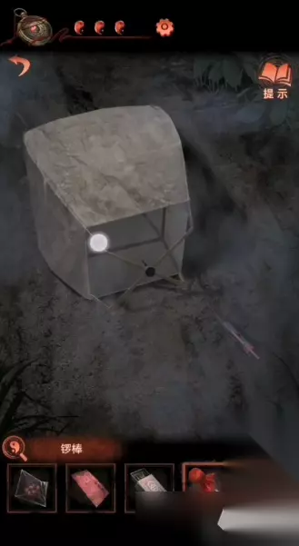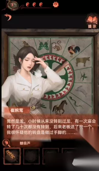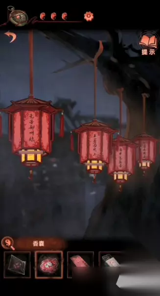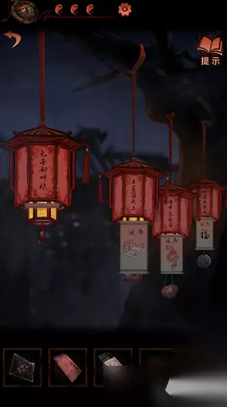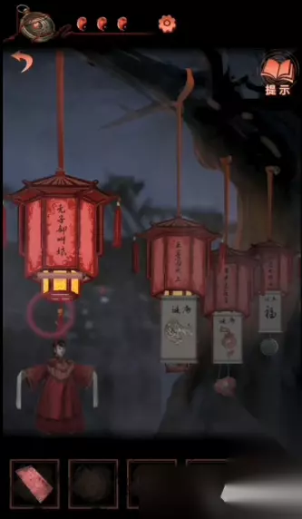 14、然后点击右侧树上的灯谜灯笼,每一个灯笼都会有谜语,根据谜语把老虎布偶、香囊、福字玉佩挂好可以获得锣棒,如下图: