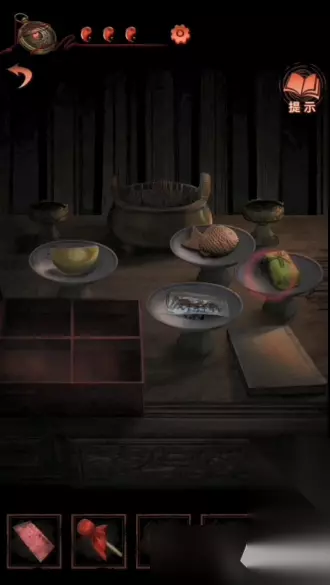 30、之后前往第三个场景(不切换时间 也行),将铜钱放入那个特产摊的托盘里,可以获得特产礼盒; 31、然后回到小庙内,点击桌上的碗,将礼盒放上去,根据右侧书籍的线索,摆放位置如下: