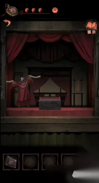 10、到最右侧的场景,点击木偶戏台,将鞋盒给上面的纸人可以得到一个香囊;