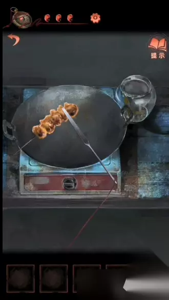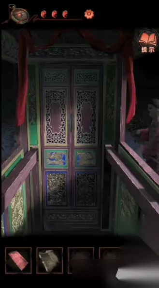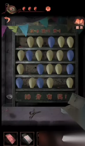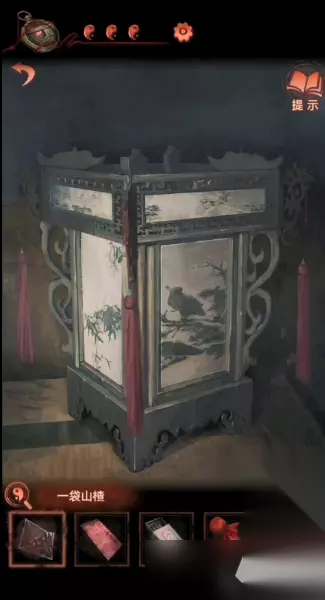 17、回到中间的场景,点击左侧桌子上的那个灯笼,按照“左中左左右左”的顺序来拉动挂饰,就可以获得一个元宝和剪刀;