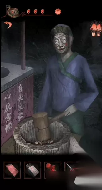 20、然后到第三个场景中,将面具放在那个糍粑摊老板的脸上,将山楂放进去,老板会将山楂捣碎获得山楂核;
