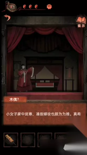 33、切换时间到二更(纸人会没),还是敲锣四次,然后到那个木偶戏台,把红绳给木偶获得一个木偶新娘;
