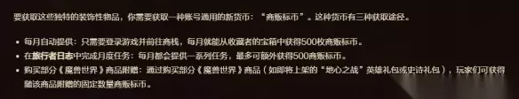 方法三:购买部分《魔兽世界》商品附赠 玩家购买一些包含商贩标币的商品可获得标币,如即将上架的“地心之战”英雄礼包或史诗礼包。