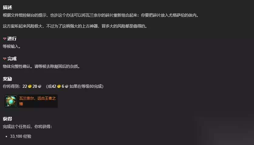 3、接着需要击败尤格萨伦,获得重铸的远古王者之锤。 4、最后任务完成即可获得瓦兰奈尔,远古王者之锤和22金20银。