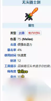 获取方式 1.合成增益:玩家在山铜砧或秘银砧附近使用塔拉之刃+彩虹猫之刃+狂星之怒+浪涌之刃+无头登山剑+种子弯刀+星之怒+养蜂人+魔剑+铜匕首可以合成一把天顶剑。 2.无头骑士剑可以在南瓜月活动中被南瓜王Boss掉落。 武器鉴定 1.无头骑士的剑可以自动挥舞,但是挥舞的时候不能转身,碎钢剑也是一样; 2.召唤出来的南瓜会攻击,造成和武器基础伤害一样的伤害,有几率造成暴击; 3.用无头骑士之剑召唤出来的南瓜虽然不会攻击玩家,但是接触到其他玩家也会造成伤害; 4.之前写塔拉瑞亚的boss攻略的时候提到过,杀死猪鲨公爵时使用无头骑士剑很神奇,因为每次攻击泡泡都会生成南瓜。