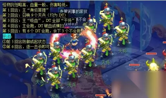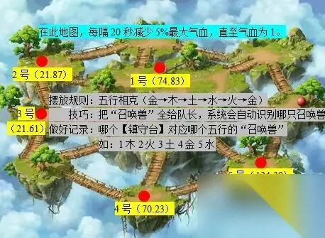 5、去天宫(242.20)对话【守门天将】然后找“召唤兽x5”,找齐后,将“召唤兽”交易给队长; 种类:①芙蓉仙子、星灵仙子、如意仙子等师门宠。 ②灵符女娲(女娲神迹,捕捉)、律法女娲、雾中仙、幽灵(商会,吸附宠)等 注:若捕捉不到指定五行,可前往【五行大师】(长安城355.115)处更改五行 6、去天宫(242.20)找【守门天将】传送至“偏僻一角”,把“召唤兽x5”放到【镇守台】上; 7、找【镇守台】进入战斗,按照“五行相克”原则挑战【镇守台】,全部打完后自动传送至“长安城·天台”;