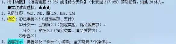 《梦幻西游》独弦琴之思任务攻略: 任务准备: 1、凌霄宝殿(55.26)找【杨戬】或长安城(217.169)找【传令天兵】领取任务,难度选择3星,消耗20体力。 2、队伍阵容:WD、NE、魔 ES、HG、SM 3、物资: ①召唤兽x5(指定类型、五行) ②分支一:三级药x5(指定类型,有品质要求) 分支二:烹饪x5(指定类型,有品质要求)。 ③乐器x1(神器涉及“奏乐”小游戏,至少需要3个操作手)