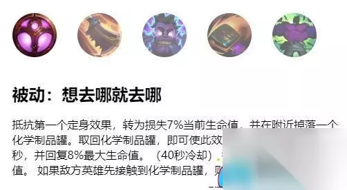 蒙多医生的技能秘籍 被动技能 —— 自由之足 蒙多医生拥有摆脱束缚的能力,他能够抵抗一次定身效果,代价是牺牲一部分生命值,并留下一瓶化学药剂。若能及时回收,他将部分回复生命之力,并缩短这一能力的冷却时间。要留意,敌手也可破坏这瓶药剂。蒙多还拥有基于最大生命值的额外回复能力。