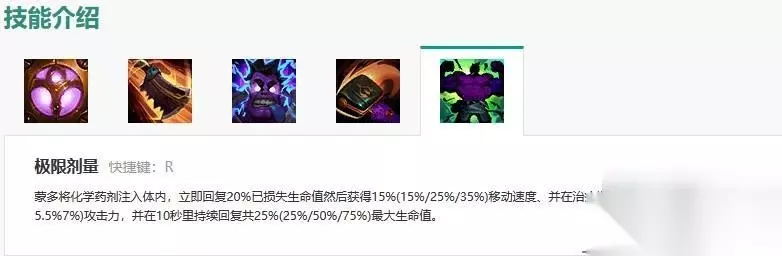 Q技能 —— 病毒屠刀 蒙多医生投掷一把沾满病菌的骨锯,给首个接触的敌人带来基于其当前生命值的魔法损伤,并施加减速魔咒。 W技能 —— 电击疗法 自施电击治疗,持续对附近敌人造成魔法伤害,并将部分伤害转化为灰色生命值。技能结束时,对周遭敌人造成一次爆炸性的魔法伤害,击中敌人时可回复对应的灰色生命值(对小兵与怪物的治疗效果降低)。蒙多医生可以再次启动此技能,以提前结束其效果。 E技能 —— 大力行医 被动效果下,蒙多医生将根据已损失的生命值获得额外攻击力。 主动施放时,蒙多医生用“医用”手提包猛砸敌人,基于已损失生命值造成物理伤害。若此技能击溃敌人,将使其被击飞,对路径上的敌人造成最小伤害。 R技能 —— 极限剂量 蒙多医生注射强效药剂,瞬间恢复一定比例的已损失生命值,随后持续回复生命力的同时,获得额外移速与攻击力。