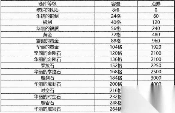 dnf仓库升级所需价格一览 答:升到满级共需要65730点券。 1、第1阶段:生锈的铜质。仓库扩容至24格空间 ,需要60点卷 2、第2阶段:银质。仓库扩容至40格空间 ,需要120点卷 3、第3阶段:华丽的银质。仓库扩容至56格空间,需要240点卷 4、第4阶段:黄金。仓库扩容至72格空间 ,需要480点卷 5、第5阶段:耀眼的黄金。仓库扩容至88格空间 ,需要960点卷 6、第6阶段:华丽的黄金。仓库扩容至104格空间,需要1920点卷 7、第7阶段:坚固的金刚石。仓库扩容至120格空间 ,需要2100点卷 8、第8阶段:华丽的金刚石。仓库扩容至136格空间,需要2100点卷 9、第9阶段:泰拉石。扩容至152格空间,需要2250点卷 10、第10阶段:华丽的泰拉石。扩容至168格空间,需要2500点卷 11、第11阶段:魔刹石。扩容至184格空间,需要3000点卷 12、第12阶段:华丽的魔刹石。扩容至200格空间,需要4000点卷 13、第13阶段:时空石。扩容至216格空间,需要6000点卷 14、第14阶段:华丽的时空石。扩容至232格空间,需要9000点卷 15、第15阶段:魔岩石。扩容至248格空间,需要13000点卷 16、第16阶段:华丽的魔岩石。扩容至264格空间,需要18000点卷