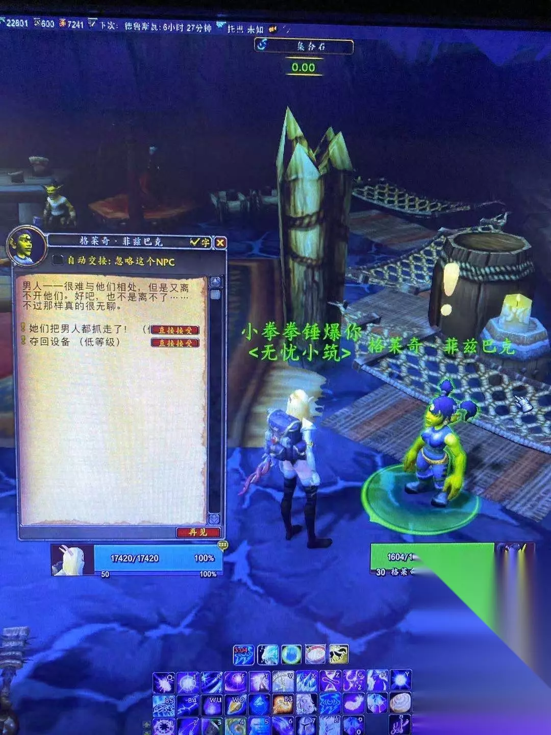 又大又白的大熊熊 虽然发现网上的攻略已经很多了,但是唐小宝也是跟着某些攻略按部就班的照着任务做着走,可是仍然出现了问题,当我做完整个流程以后,竟然发现没有日常!这是怎么回事呢?在我的逛遍整个女人村后,我终于发现了女人村的秘密,啊呸,是女人村日常的关键所在!下面我就为大家详细解析整个任务流程和不能正常接到日常任务的情况吧! 之一步不用多说,咱们就去奥格的传送门大厅直接找到传送到旧达拉然(晶歌森林)的传送门, 然后小伙伴们就要打开地图找到风暴峭壁坐标40.85处的k3地堡里面,找一个叫格莱奇·菲兹巴克的女地精,接去初始任务:1.她们把男人都抓走了!2.夺取设备。
