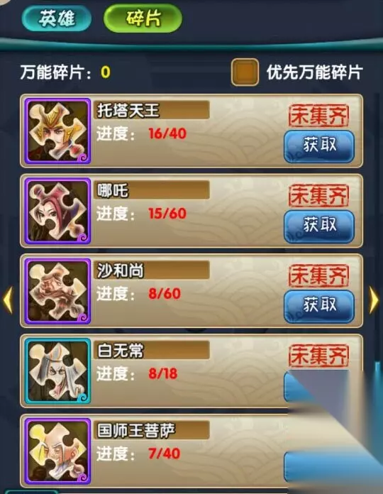 图7-《天天来取经》英雄加盟 2、 紫卡碎片合成。 紫色英雄的紫卡碎片可以合成一个紫色英雄,一般40或60个碎片合成一个紫卡英雄,因此任何一个可以获得碎片的机会都不要放过!
