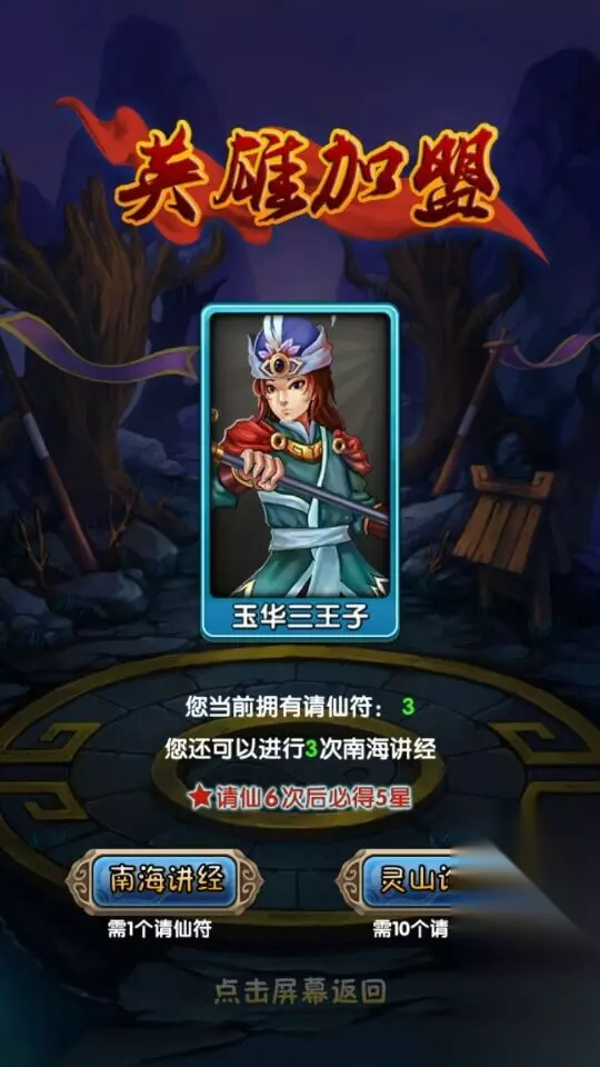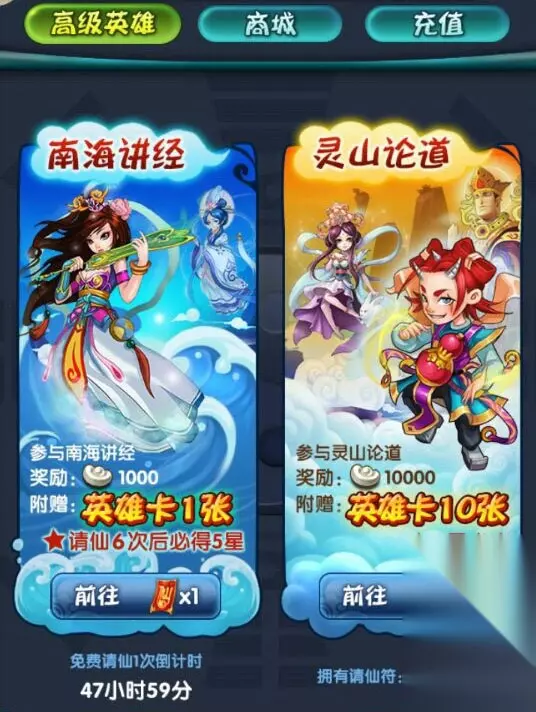 图6-《天天来取经》南海讲经请仙 1、 请仙符。 请仙符可以在商城请到英雄,而出现紫色英雄的几率最低是请仙7次之后出5星紫卡!请仙符的获得可以通过商城购买,或者登陆时的免费奖励。