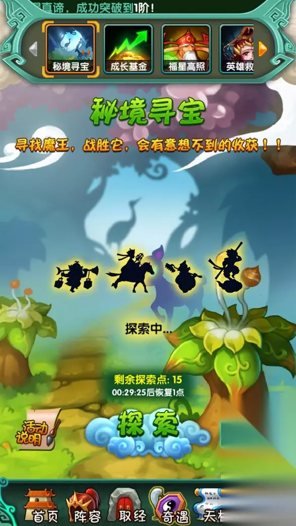 图8-《天天来取经》秘境寻宝 紫卡碎片可以通过达到一定等级以后秘境寻宝获得,也可以通过打怪获得,还可以通过28级以后英雄的试炼获得,更可以在商城购买!