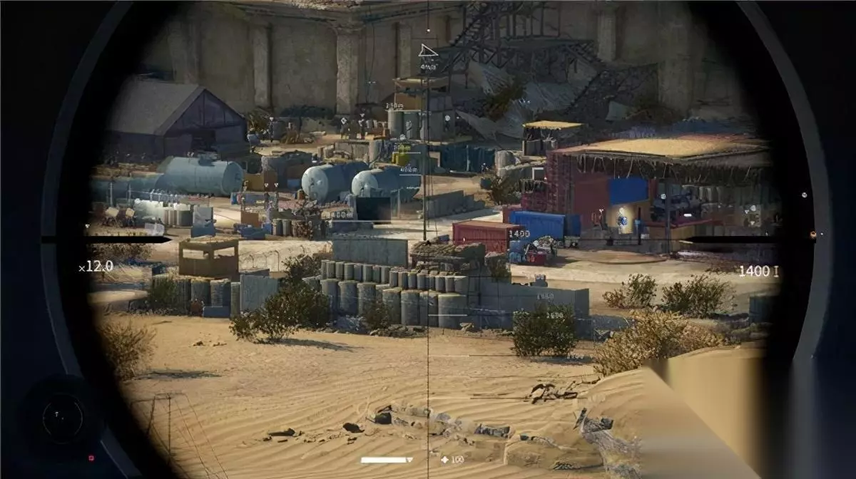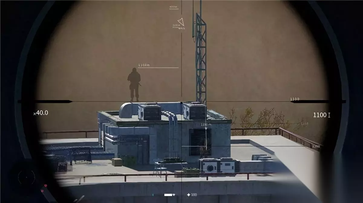 先来说狙击。作为切题的玩法,狙击是游戏中最核心的部分,但这里需要先介绍一下它的机制。因为在这个(系列)游戏中,狙击玩法和通常认知的 " 直接瞄准 "、" 预判 " 不太相同。 你可以看到,开镜后,镜中右侧会显示一个标识距离的刻度尺,你需要按照当前目标的距离调整其数值;旁边不时闪出一条白色的流线,这代表了风向和偏斜。此二者便是扣下扳机前需要参考的指标,也就是说,你要调整好两个因素,最后才能开火。 以下图为例,目标距离我 1184 米,那么我把狙击镜右侧刻度调整为 1100-1150-1200 …之后把对方的脑袋圈在 1150 米和 1200 米中间——大概是 1184 米的位置,然后再去观察流线,让脑袋与流线重合(些许误差不用在意),调整完毕之后,深呼吸,扣下扳机,几乎 100% 爆头。
