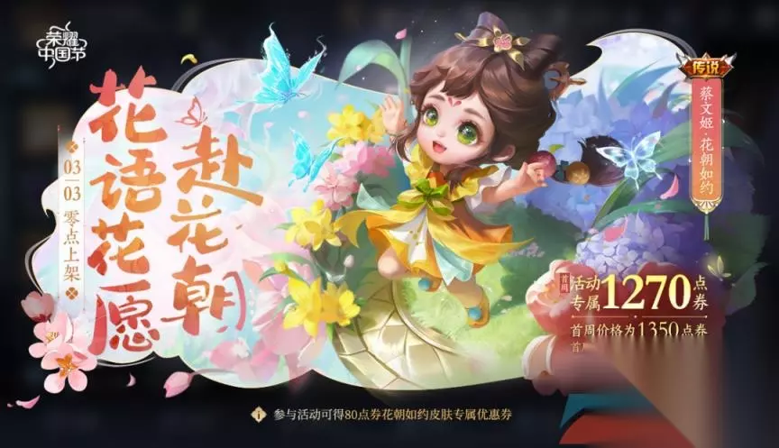 很多小伙伴可能还不太清楚王者荣耀蔡文姬花朝如约新皮肤皮肤获取价格介绍,今天小编整理了相关的内容可供大家参考。 王者荣耀蔡文姬花朝如约新皮肤皮肤获取价格介绍 一、价格介绍 蔡文姬花朝如约新皮肤价格介绍 1、英雄:蔡文姬。 2、皮肤名称:蔡文姬-花朝如约。 3、上线时间:2022年3月3日00:00。 4、皮肤原价:1688点券。 5、首周优惠:1350点券。 6、活动专属价:1270点券。