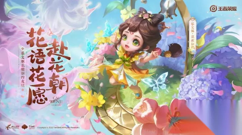 二、皮肤介绍 1、皮肤故事 此次荣耀中国节皮肤以两个传统节日为主,这款皮肤就是围绕着传统节日花朝节开启的,皮肤名为花朝如约。花朝节是百花的生日,所以皮肤整体以花朵为主,以蝴蝶作为点缀。此次皮肤一改蔡文姬原本的坐骑,将原本的改成了花篮,让人物在花簇中释放技能。