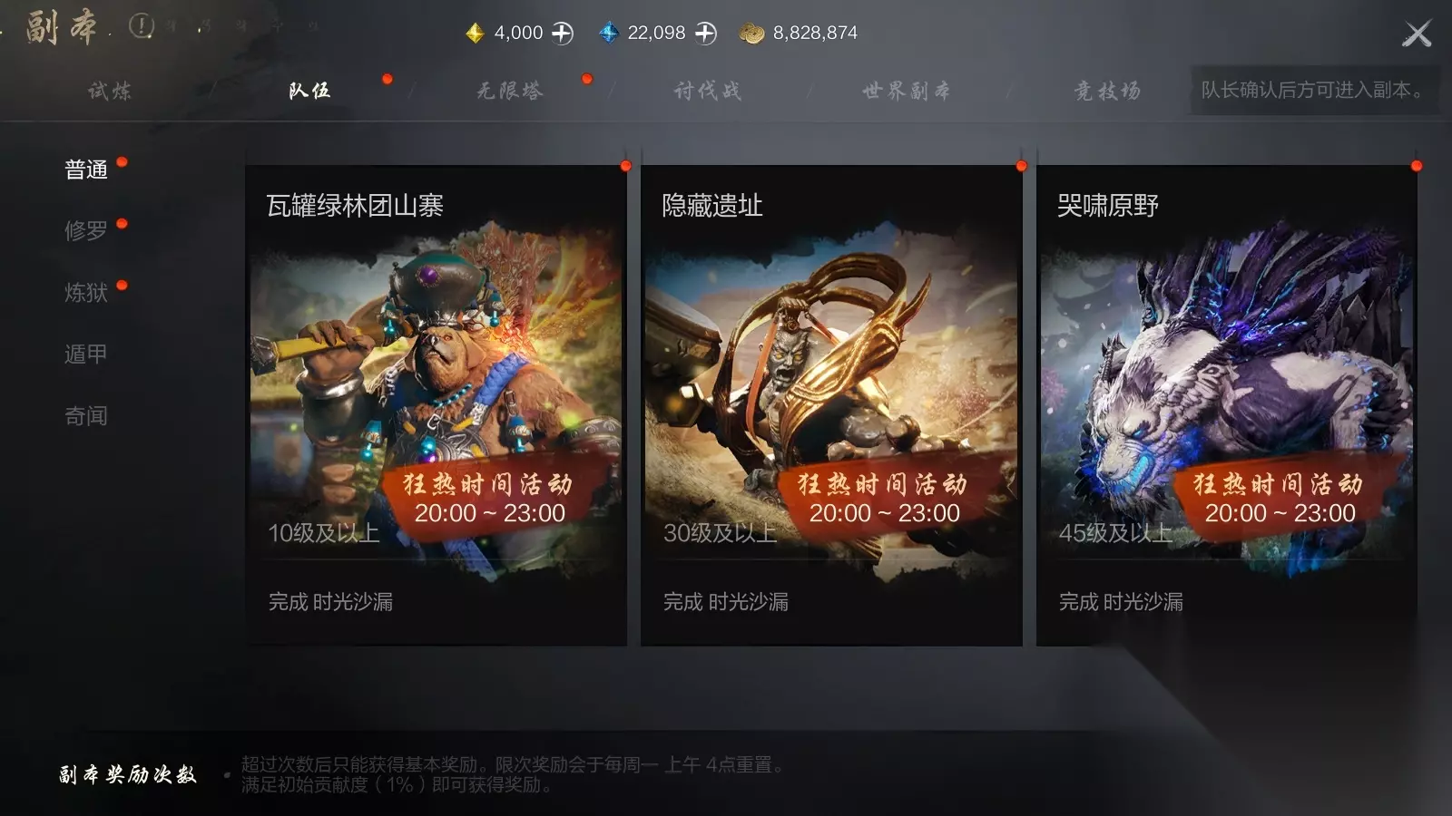 ?世界副本 开启时间:每周二、四、六,挑战世界副本,会掉落遗物、命运星图的炎煌之星的材料。 快来叫上你的伙伴,一同前往挑战!将珍稀装备拿回家!