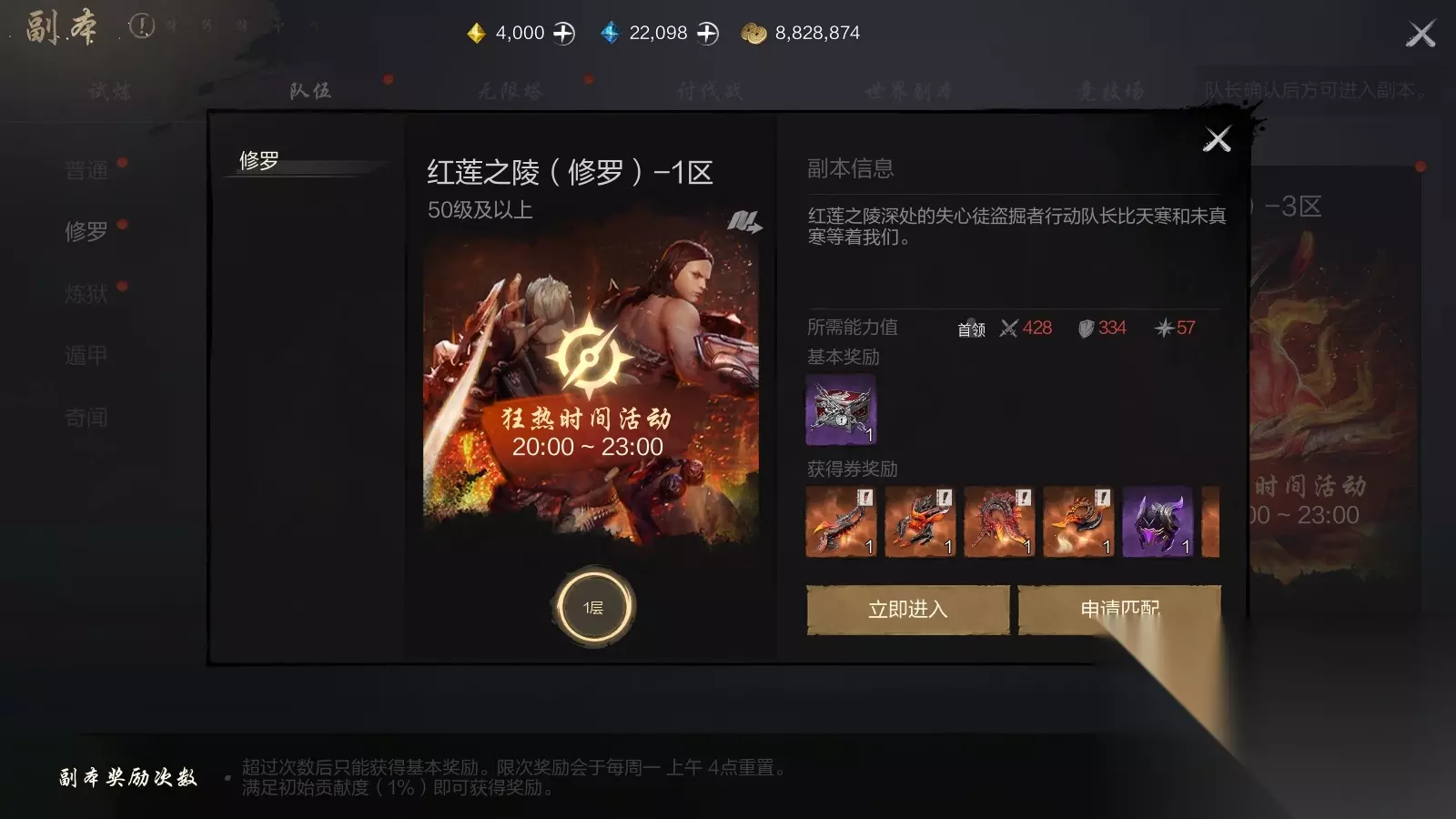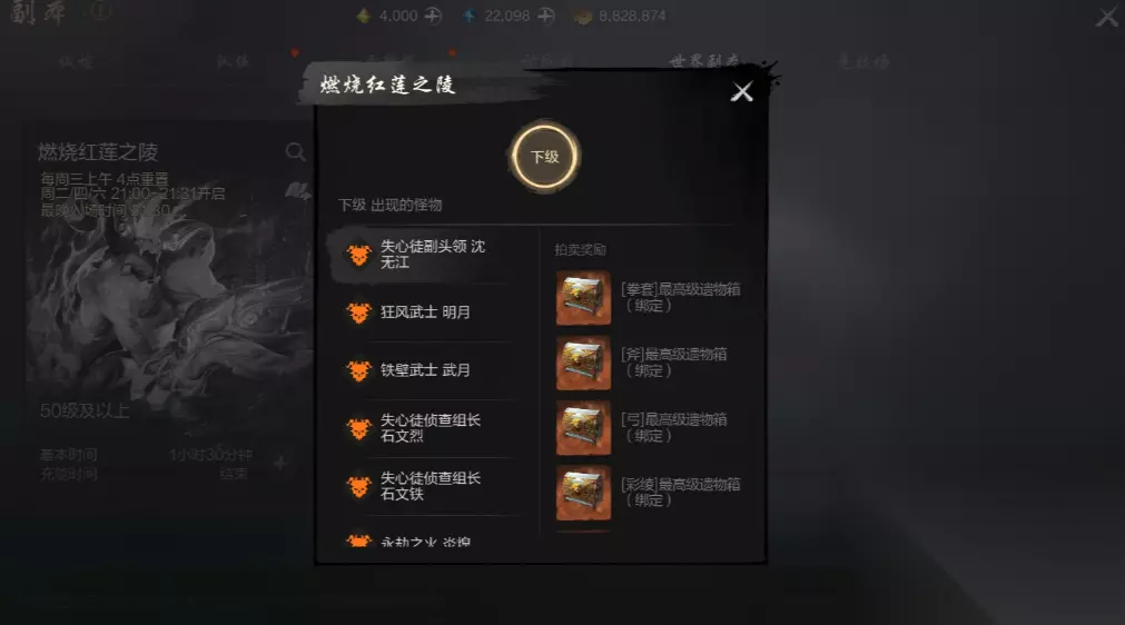 2)进阶难度,修罗红莲之陵副本 进阶难度,修罗红莲之陵副本 推荐玩家等级:达到50级以及上的玩家参与的副本挑战难度越高,能拿到的装备越优质!玩家们还有机会获得至尊武器稀有装备。 修罗副本分为3个区域,每个区域会掉落相同武器、永劫之火防具、八卦,还有真・愤怒之炎外观,不同的服装、至尊永劫之火套装防具。