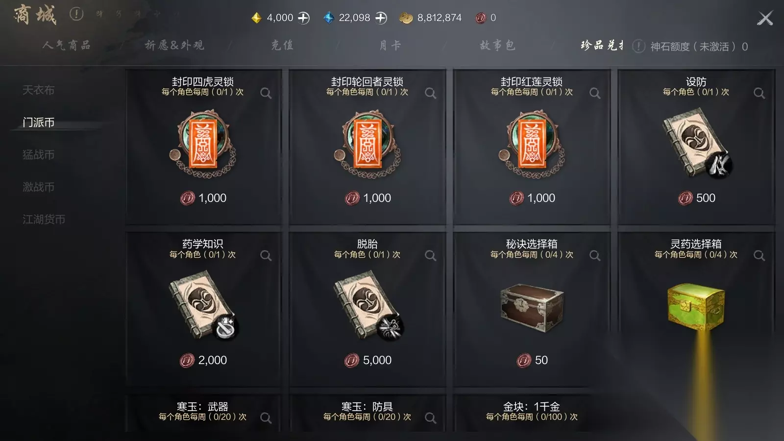 ②PvP玩法会产出猛战币,可以在商城-兑换珍品里兑换PvP武器和八卦牌。 ③门派玩法,会产出灵锁,也可以通过门派活动积攒门派币,在商城-珍品兑换里进行兑换。