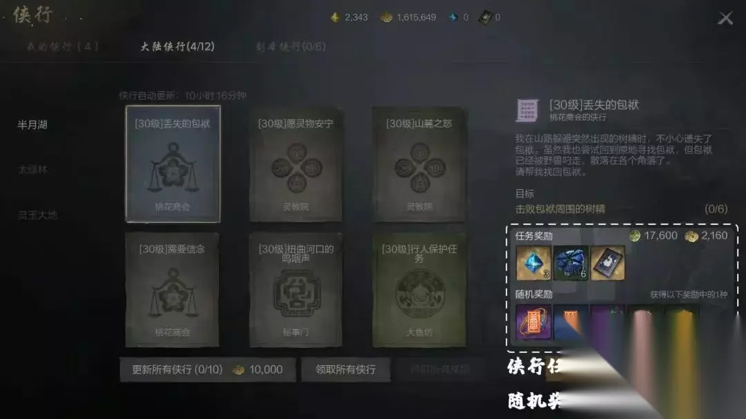 5、 挑战侠行任务,装备道具统统拿下 玩家们完成侠行任务,可获得被封印的装备等随机奖励。 且完成的侠行任务质量越高,可获得随机奖励品质越高噢,玩家们可结合自己的战力和需求,选择侠行任务挑战噢~