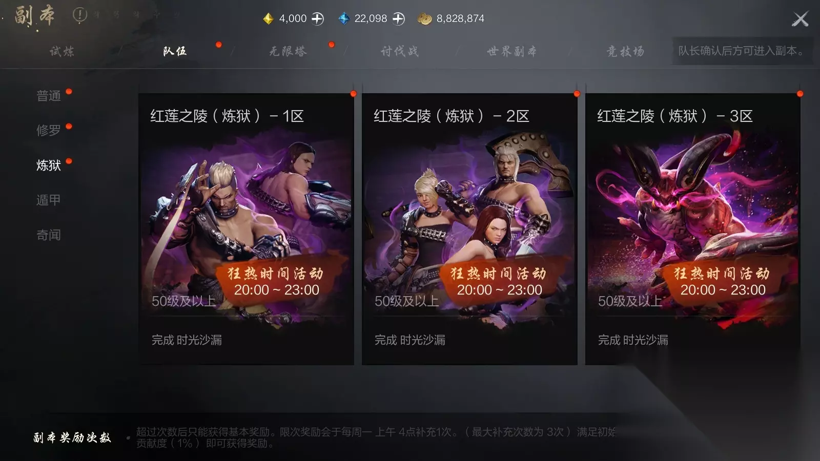 3)挑战难度,炼狱红莲之陵副本 ?挑战难度,炼狱红莲之陵副本 推荐玩家等级:达到50级以及上的玩家 对于等级较高,属性技能战力都比较自信的玩家们,不妨开启挑战炼狱难度! 炼狱副本难度较高,推荐找值得信赖的玩家伙伴组队前往,注意作战策略,协同合作击败boss,拿下副本通关胜利。 炼狱副本同样分为3个区域,除了掉落与修罗难度相同的防具外,还会掉落可以指定职业的武器箱、三星八卦牌,以及最高级红莲之陵外观――真・愤怒之焱。