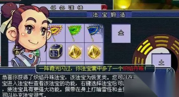 二、合成技巧 1、玩家如果想合成1级以上的法宝,就需要玩家要注意五行的相生相克。 2、相生:金->水->木->火->土->金,相克:金->木->土->水->火->金。 3、并且玩家可以使用一个一级法宝以及三眼天珠、九眼天珠、人参果等不同的特殊物品。
