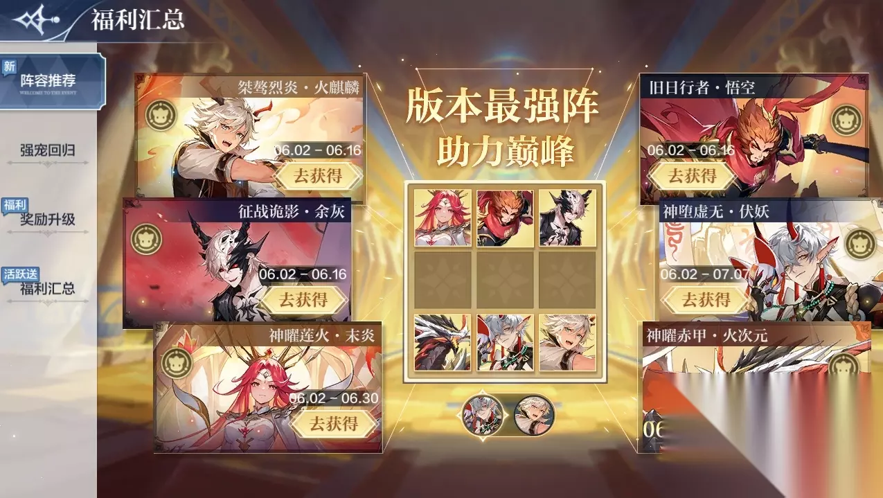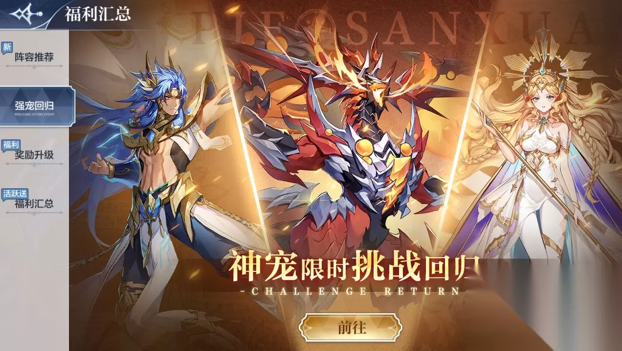 【挑战回归】传说精灵挑战回归,神宠助力版本阵容! 活动内容:传说精灵挑战限时回归! 精灵一览: 6.9-6.23:神王·星洛 6.16-6.23:赤龙银甲·火次元 6.23-7.7:创世天命·弥娅 注:挑战将继承进度;