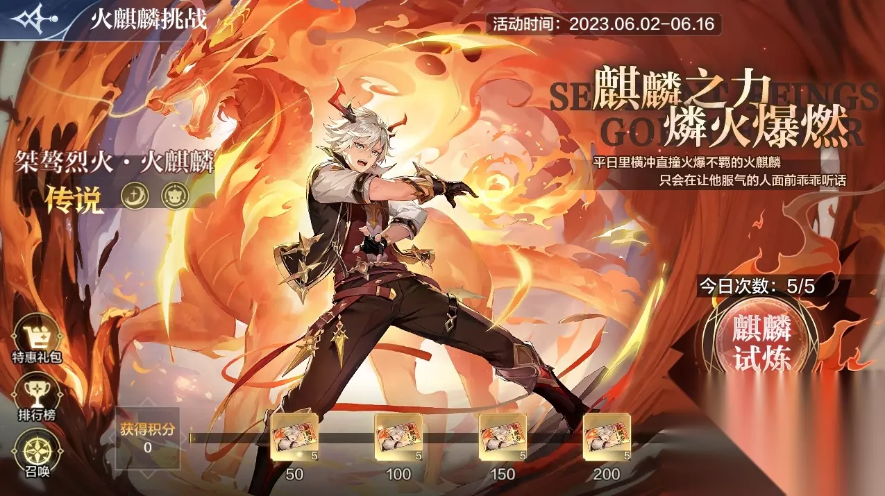 【麒麟试炼】桀骜烈炎·火麒麟挑战开启!完成挑战得火麒麟券*120! 活动时间:6月2日-6月16日 活动内容:最新精灵【桀骜烈炎·火麒麟】挑战来袭! 火麒麟挑战共分为五个难度:简单难度、普通难度、困难难度、磨难难度以及噩梦难度; 玩家根据选择难度不同将抽取不同的战斗规则; 完成挑战可得累计火麒麟券*120; 【火麒麟召唤】120抽必得桀骜烈炎·火麒麟&火属性橙装宝箱 活动时间:6月2日-6月16日 累计召唤奖励一览: 累计召唤20次:召唤券*2 累计召唤40次:召唤券*2 累计召唤60次:召唤券*3 累计召唤80次:随机橙装宝箱*1 累计召唤100次:随机橙装宝箱*1 累计召唤120次:火属性橙色装备自选箱*1 累计召唤160次:火麒麟之魂*1 累计召唤200次:火属性+1突破石 累计召唤240次:火麒麟之魂*1
