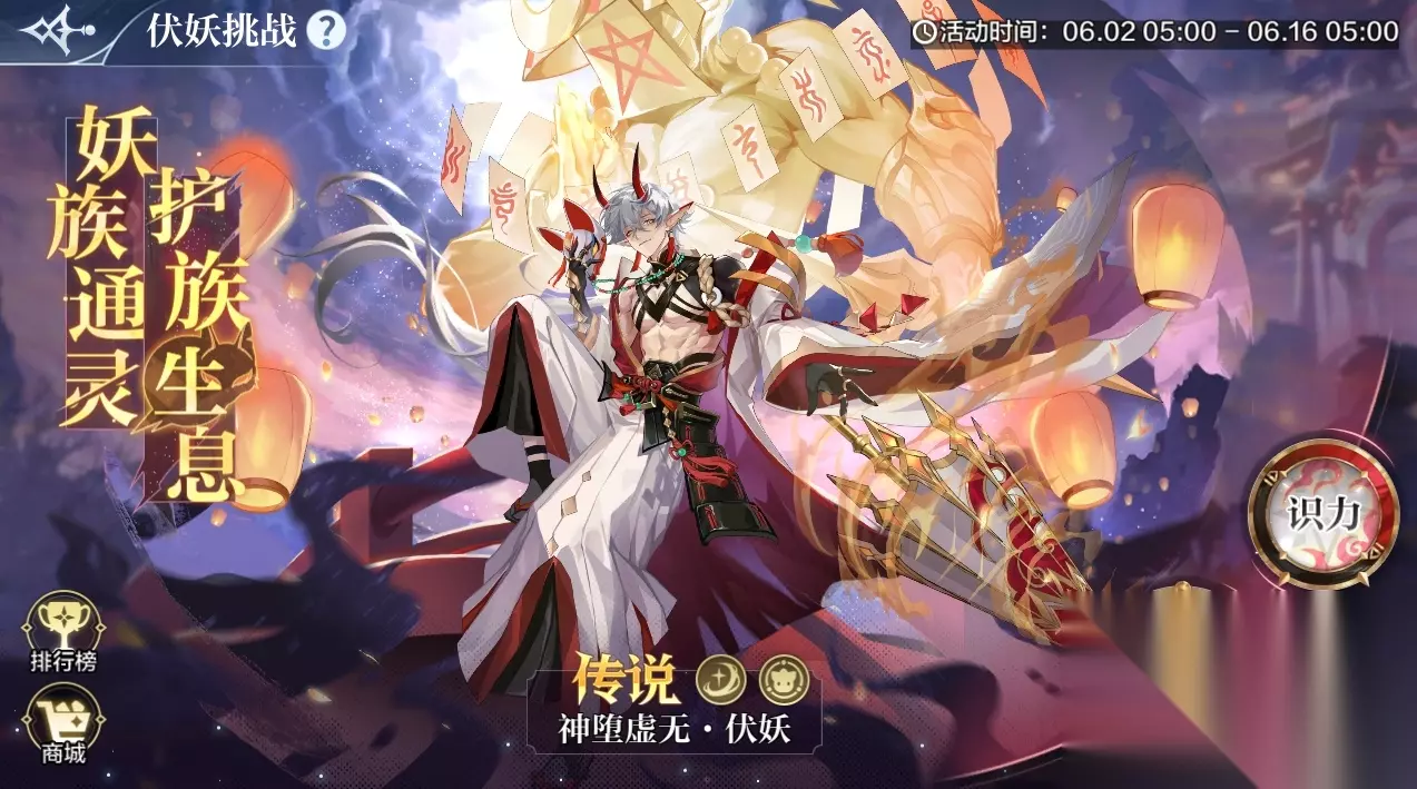 【神堕虚无】剧情更新·饿鬼屠鬼 活动时间:6月2日更新后 活动内容: 身为神裁协盟的执法者,伏妖冷酷无情,祂与协盟订立契约的目的自始至终都是为了追寻过往,凭借辛勤汗水与无上忠诚换取协盟的力量支持在祂看来合情合理,而作为精灵大陆为数不多的命运拐点,祂的出现是为良机…… 【神堕虚无】伏妖挑战正式开启!强力通灵师登场,参与挑战得伏妖&限时至尊券! 活动时间:6月2日-6月16日 活动内容:神堕虚无·伏妖挑战来袭,携强力通灵技登场!除奸邪污秽,荡八方乱世,伏妖参上! 挑战内容共含两部分: 【识力】挑战1、该挑战没有限制挑战次数,通关即可获得挑战奖励内容;2、次日不会重置挑战进度;【辨强】挑战1、每个关卡挑战胜利后,将记录该关卡累计控制次数;2、挑战失败则不会记录控制次数;3、所有关卡均可重复挑战,挑战结束后记录最高控制次数;4、所有关卡挑战胜利且达到所需控制次数时获得【神堕虚无·伏妖】;