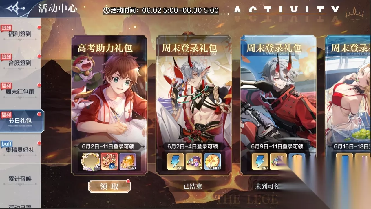 【神钻召唤】传说精灵神钻召唤回归!强力神宠限时召唤得! 活动时间:6月2日5:00-6月16日5:00 传说精灵:旧日行者·悟空、征战诡影·余灰、继承者·以世、命定之恶·尘 本期累计召唤奖励一览: 累计召唤30次:神唤券*2; 累计召唤60次:神唤券*2; 累计召唤80次:神唤券*3; 累计召唤100次:神唤券*5; 累计召唤120、240、360、480、600次:精灵自选箱*1(旧日行者·悟空、征战诡影·余灰、继承者·以世、命定之恶·尘) 【至尊召唤】至尊卡池开启!获最新精灵神堕虚无·伏妖! 活动时间:6月2日5:00-7月7日5:00 活动内容:最新精灵神堕虚无·伏妖加入至尊卡池,更有强力神宠:无序之神·昧、天元·王者圣龙、凯旋英神·诺亚、赫魔莉·青骨、梦魇始魔·莱莉丝、暗祭·达克诺斯限时回归! 至尊券获取: 活动签到:至尊券*10 至尊商店钻石购买:至尊券*50 限时至尊券获取: 神堕虚无·伏妖挑战:限时至尊券*20 竞技商店:限时至尊券*20(6.16日上线) 每日任务达成120活跃度:限时至尊券*35 每周任务达成250活跃度:限时至尊券*25 【集精灵享好礼】伙伴集结!收集精灵得神唤券、金币,享专属战斗加成 活动时间:6月2日-6月30日 活动内容:限定时间内,获得对应精灵即可领取:神唤券*10、金币*10万;同时获得限定BUFF:暴击率+35%、生命+20%加成!快来认识新的精灵伙伴,一起完成更多的冒险吧! 6.2-6.9:神堕虚无·伏妖 6.2-6.9:桀骜烈炎·火麒麟 6.16-6.23:神曜赤甲·火次元 6.23-6.30:水中幽冥·赛芙 【精灵排行榜】神堕虚无·伏妖、桀骜烈炎·火麒麟排行榜开启 活动时间:6月2日更新后 神堕虚无·伏妖、桀骜烈炎·火麒麟加入精灵排行榜,上榜即可获得精灵专属称号、头像及头像框! 全服精灵战力榜奖励 ①第1:全服第一战力精灵称号 ②第2-10:全服前十战力精灵称号 ③第11-100:全服前100战力精灵称号 ④第101-500:全服前500战力精灵称号 ⑤第501-1000:全服前1000战力精灵称号 本服精灵战力榜奖励 第1-300:专属精灵头像 全服精灵获得榜奖励 ①第1:全服第一获得精灵称号 ②第2-10:全服前十获得精灵称号 ③第11-100:全服前100获得精灵称号 ④第101-500:全服前500获得精灵称号 ⑤第501-1000:全服前1000获得精灵称号 ⑥第1001-5000:全服前5000获得精灵称号 本服精灵获得榜奖励 第1-300:专属精灵头像框 【幸运抽神宠】最新神宠限时超值抽 活动时间:6月2日-6月30日 活动内容:奖池更新!最新精灵【神堕虚无·伏妖】、【桀骜烈炎·火麒麟】、【神曜赤甲·火次元】、【水中幽冥·赛芙】,最新皮肤【日浴海钓·火次元】加入,欧皇的天选时刻等你来见证~ 惊喜版(首周购买额外赠送体力*120): 有5次机会分别在对应奖池抽取大奖,每次保底必得神钻*12,抽中大奖直接获得该奖励! 尊享版(首周购买额外赠送神唤券*10): 有5次机会分别在对应奖池抽取大奖,每次保底必得神钻*36,抽中大奖直接获得该奖励! 【皮肤抽奖】精美皮肤抽奖七选一回归! 活动时间:6月2日-6月16日 皮肤一览:恣意墨心·昧、灼光华宴·火次元、白蛇心·王者圣女、绯色牢笼·赤焰女王、喜饰春意·次元神女、极夜危险·无烬神女、命祈之舞·秩序神女 【秘宝商城】礼包直购更新 活动时间:6月2日-6月30日 活动内容:最新精灵神堕虚无·伏妖、桀骜烈炎·火麒麟养成礼包特惠上线! [神堕虚无·伏妖]系列: 6.2-7.7限时售卖: 伏妖满级礼包、伏妖满级星神、伏妖满技能礼包、伏妖全套橙+1、伏妖全套星神、伏妖神器 2选 1、伏妖之魂; [桀骜烈炎·火麒麟]系列: 6.2-6.30限时售卖: 火麒麟满级礼包、火麒麟满级星神、火麒麟满技能礼包、火麒麟全套橙+1、火麒麟全套星神、火麒麟之魂、火麒麟券、火麒麟券高级礼包、火麒麟券尊享礼包; 【特权打包】金钻特权卡打包福利来袭!限时两周开放购买! 活动时间:6月2日5:00-6月16日5:00 活动内容:在活动期间购买特惠礼包,含【金钻特权】*150天,原价60元,打包价45元限时两周购买! 【战令好礼】最新战令上新!解锁得最新精灵神堕虚无·伏妖皮肤头像 活动时间:6月2日-7月7日 活动内容:购买两档战令额外领取精灵皮肤【街头狂飙·伏妖】、玩家头像【街头狂飙·伏妖】,全额超值返待你解锁! 购买时间截止时间为6月30日5:00; 累计奖励一览: 免费档:召唤券*14、金币*35万 尊享战令(30元):返300神钻、神唤券*20、随机红色灵纹*1 至尊战令(68元):返680神钻、红色灵纹自选箱*1、高级精粹*200 【累充更新】充值送丰厚奖励!累充得气吞山河&传说魂 活动时间:6月2日-6月30日 活动内容:累充奖励福利再开,充值可得传说精灵、橙+1、精美皮肤、神器币等丰厚奖励! 奖励一览: 6元:召唤券*5、神唤券*5、神炼石*1 12元:随机传说精灵宝箱*1、神唤券*5、神炼石*1 30元:随机传说精灵宝箱*1、神唤券*5、神炼石*1 68元:灵纹经验*20万、神唤券*5、神炼石*1 98元:红色灵纹任选宝箱*5、神唤券*10、神炼石*3 148元:背景&传说之魂自选箱(重复获得背景转化为服装币)、神唤券*10、神炼石*3 198元:精灵/皮肤/道具40选1宝箱、灵纹经验*20万、神炼石*3 248元:金色输出星神自选箱、灵纹经验*20万、神炼石*3 288元:红色灵纹任选宝箱*5、属性橙+1自选箱*1、灵纹经验*20万、神炼石*3 328元:金色输出星神自选箱*1、灵纹经验*20万、神炼石*3 368元:传说之魂*1、属性橙+1自选箱*1、灵纹经验*20万、神炼石*3 548元:传说之魂*1、满级橙+1带属性装备自选*1、灵纹经验*20万、神炼石*3 648元:精灵/皮肤/道具40选1宝箱、灵纹经验*20万、神炼石*3 