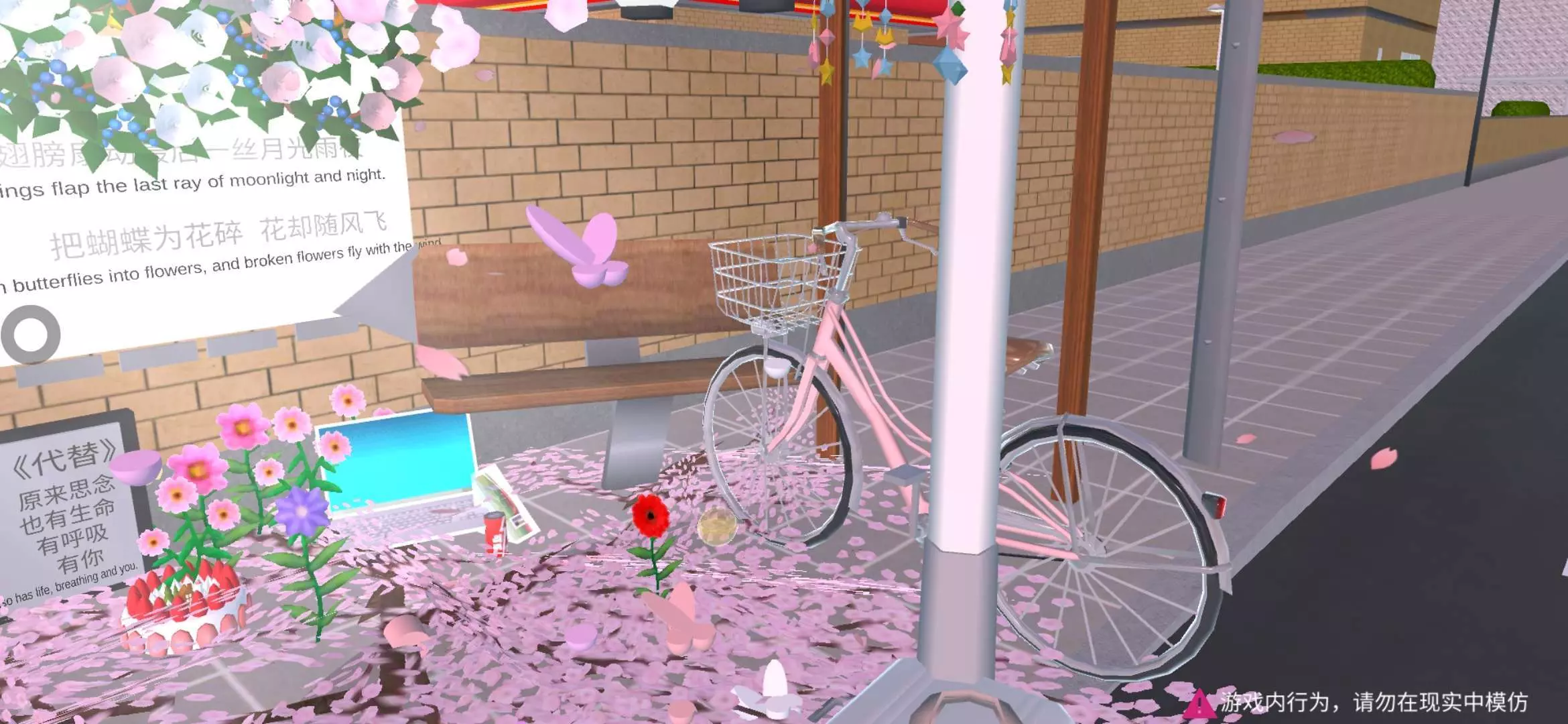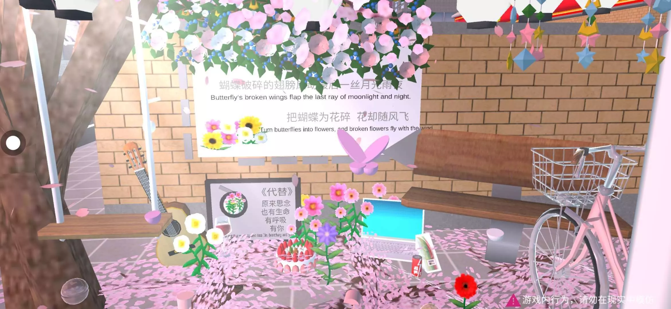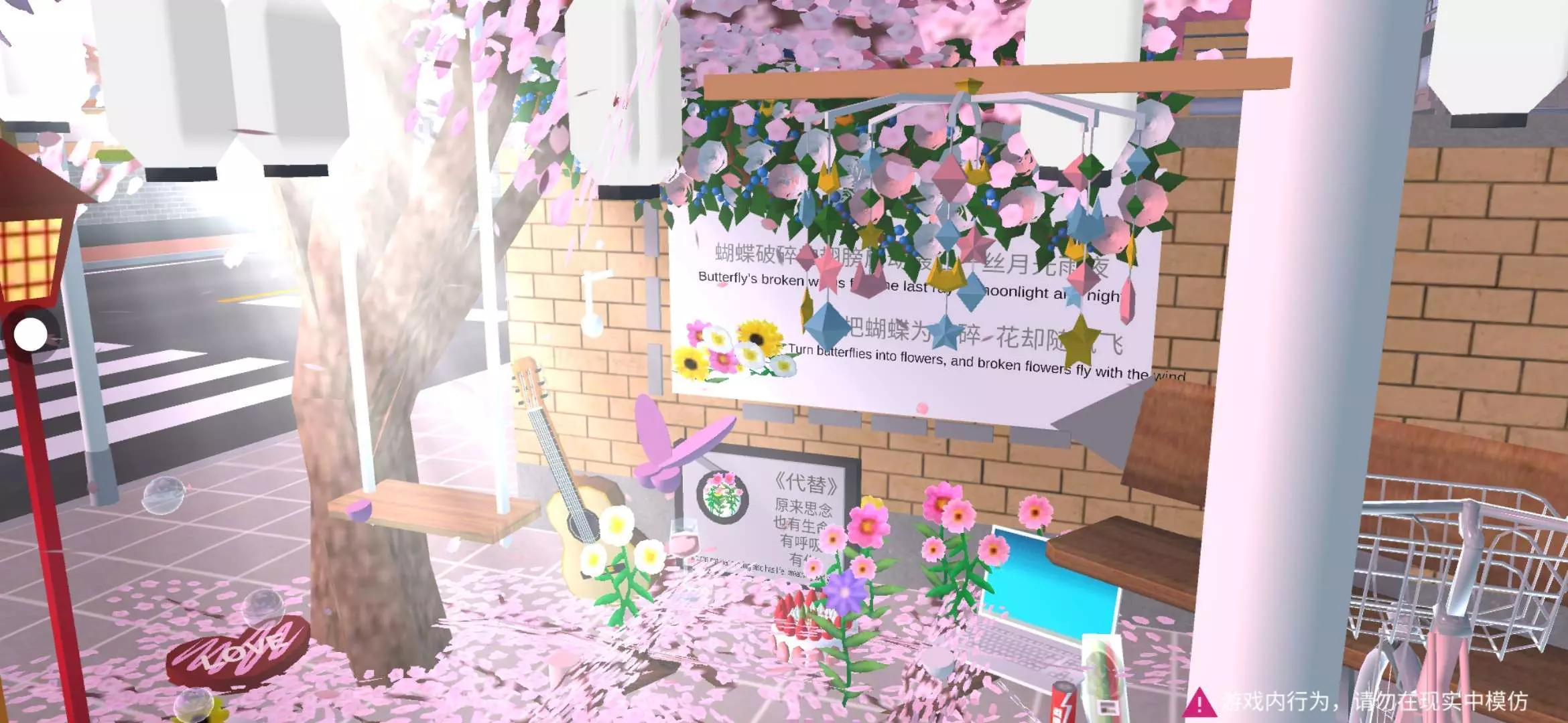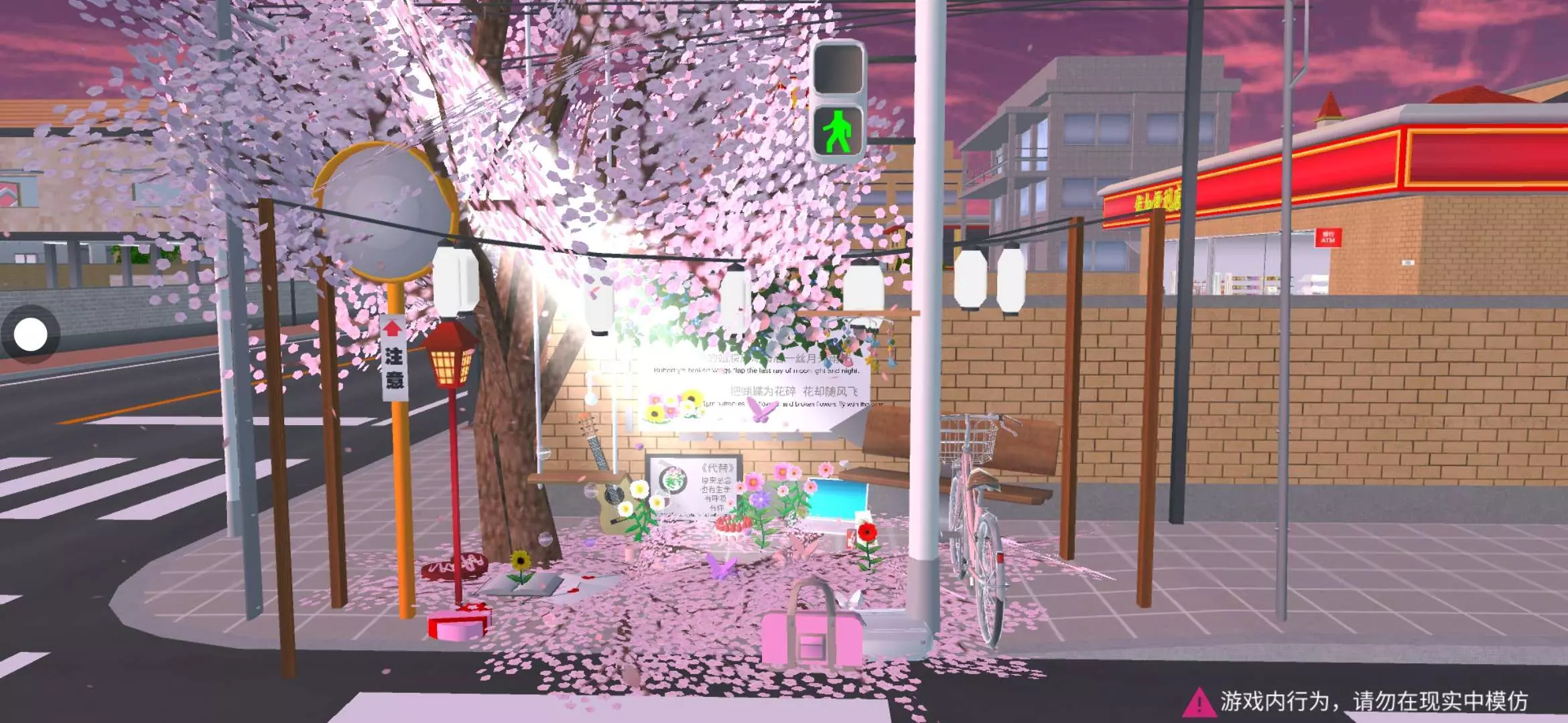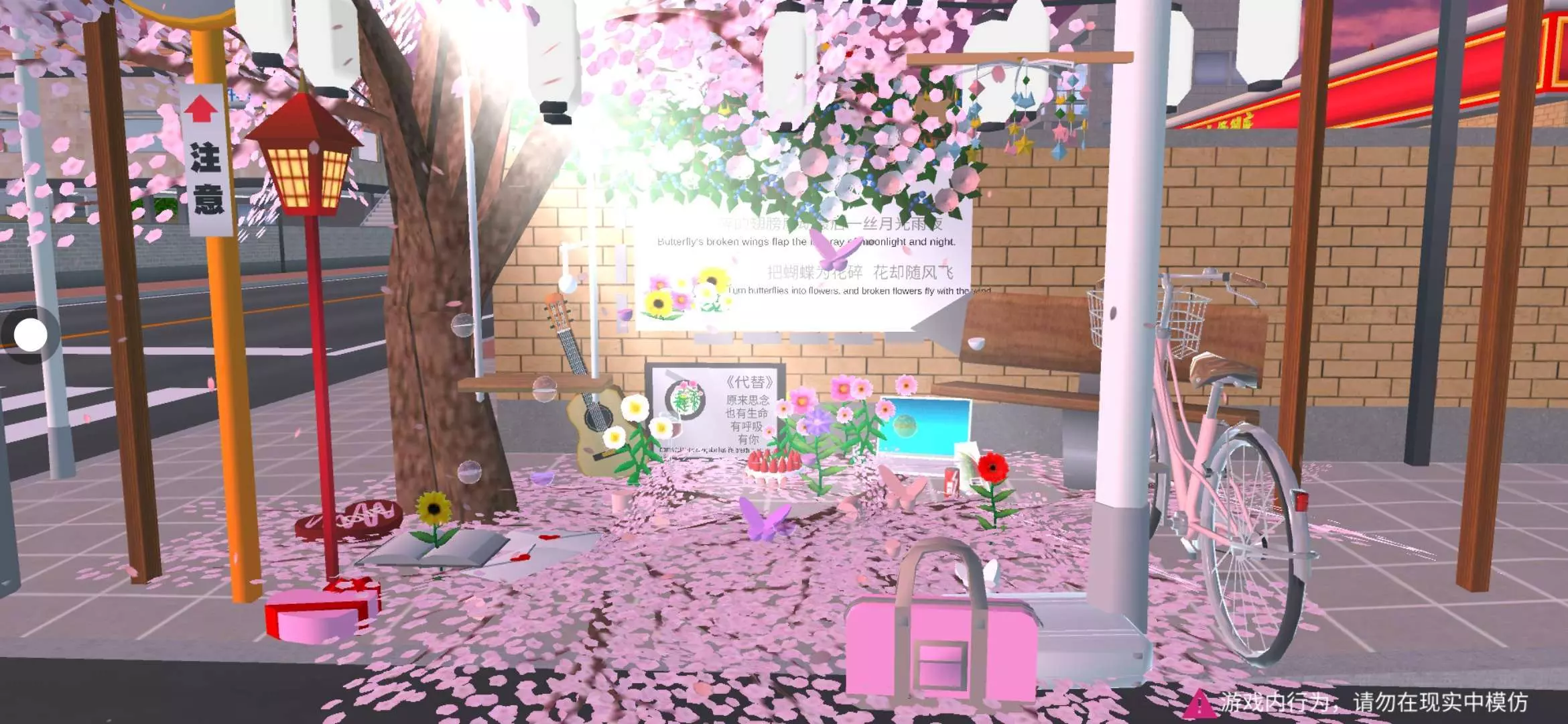 路灯散发着暖光,与粉瓣、花饰交织,营造出梦幻又感伤的氛围💧💜💛💚🧡💙此地的每一片花🌸瓣、每一件物品,都似是时光的碎片,拼凑出一场盛大又寂寥的回忆盛宴🚲 介绍完毕 感谢喜欢 游完建筑请记得艾特标明