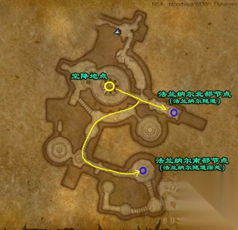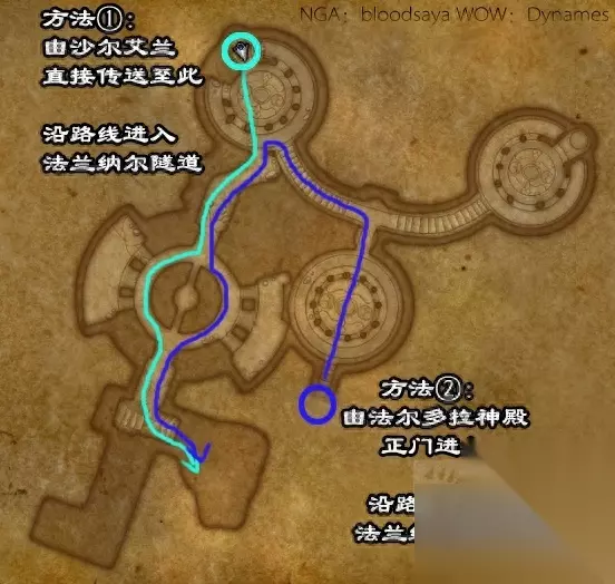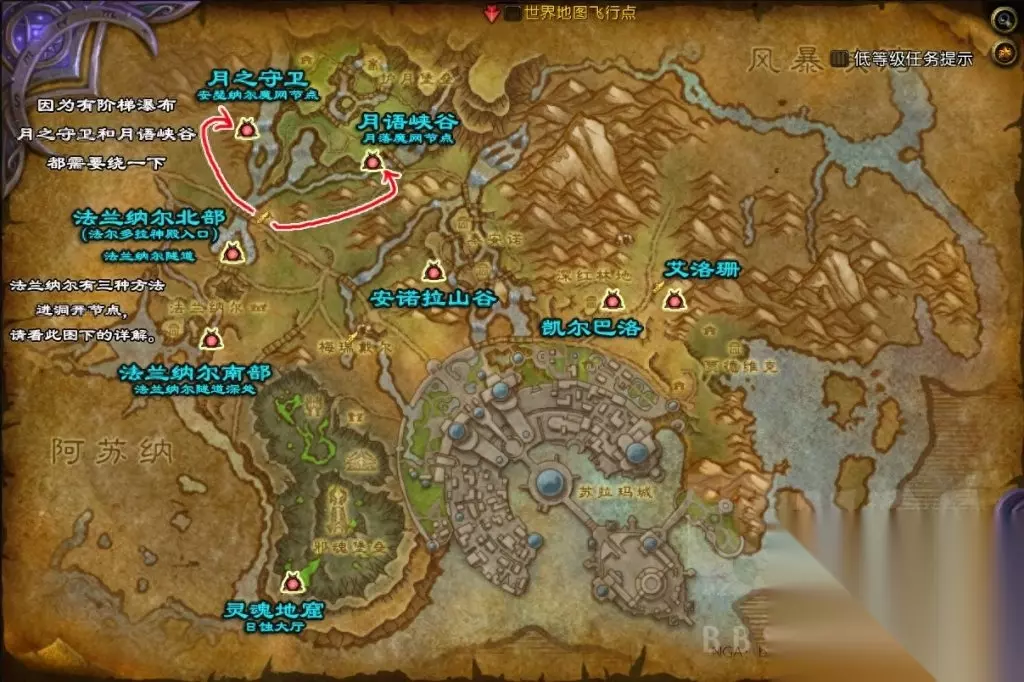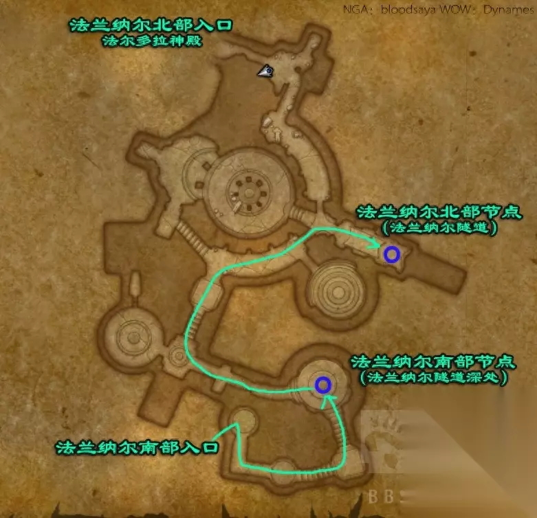 法兰纳尔部分两节点详细跑法: 法兰纳尔的两个魔网节点都在地下的洞里,有三种跑魔网节点的方法。 第一种,从北部的法尔多拉神殿入口进入,穿过破碎轨迹,进入法兰纳尔隧道。(开了法拉多尔传送门的可以直接传送)