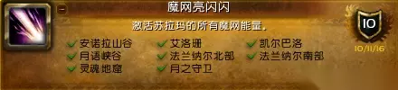 此任务会要求你激活7处魔网能量,他们分别为: 艾洛珊 凯尔巴洛 月落魔网节点 安瑟纳尔魔网节点 法兰纳尔隧道 法兰纳尔隧道深处 日蚀大厅 “魔网亮晶晶”成就 8个魔网能量点: