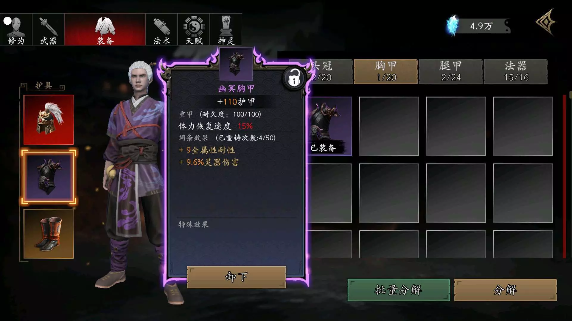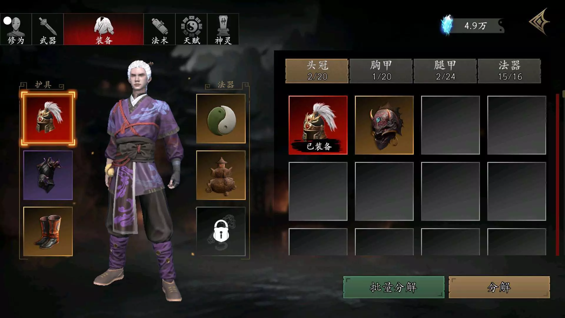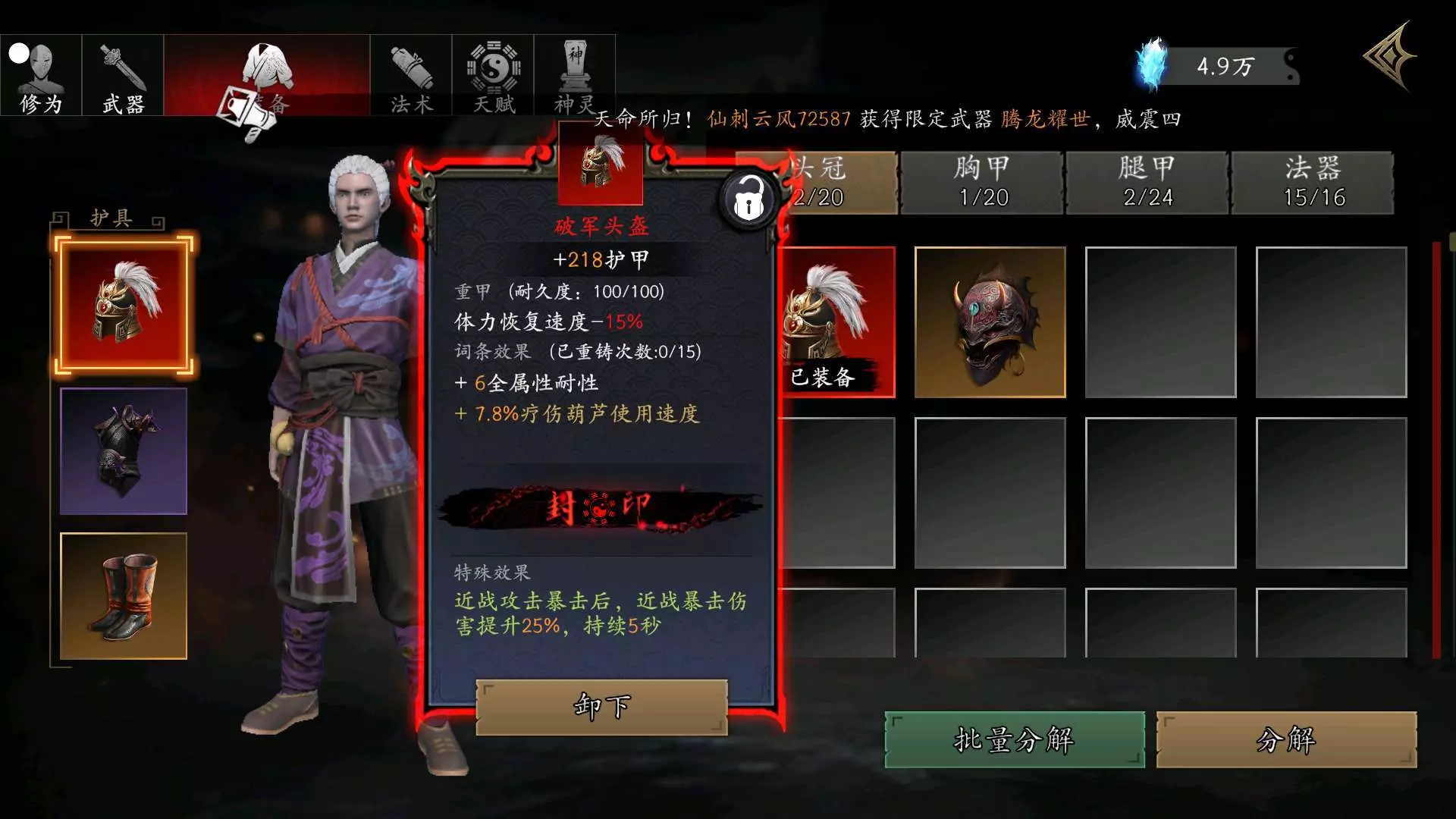 #捕盗行纪 破军头盔是390通宝买的,幽冥胸甲是BOSS掉的,天罡护腿、阴阳鱼、紫虚炉都是100通宝买的