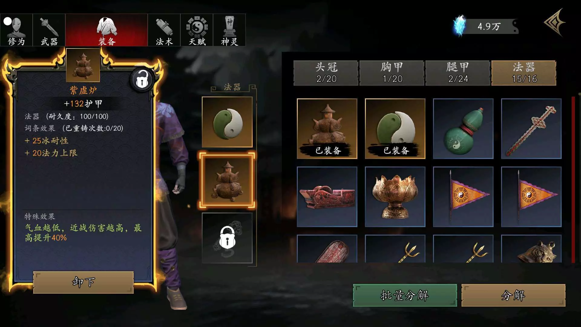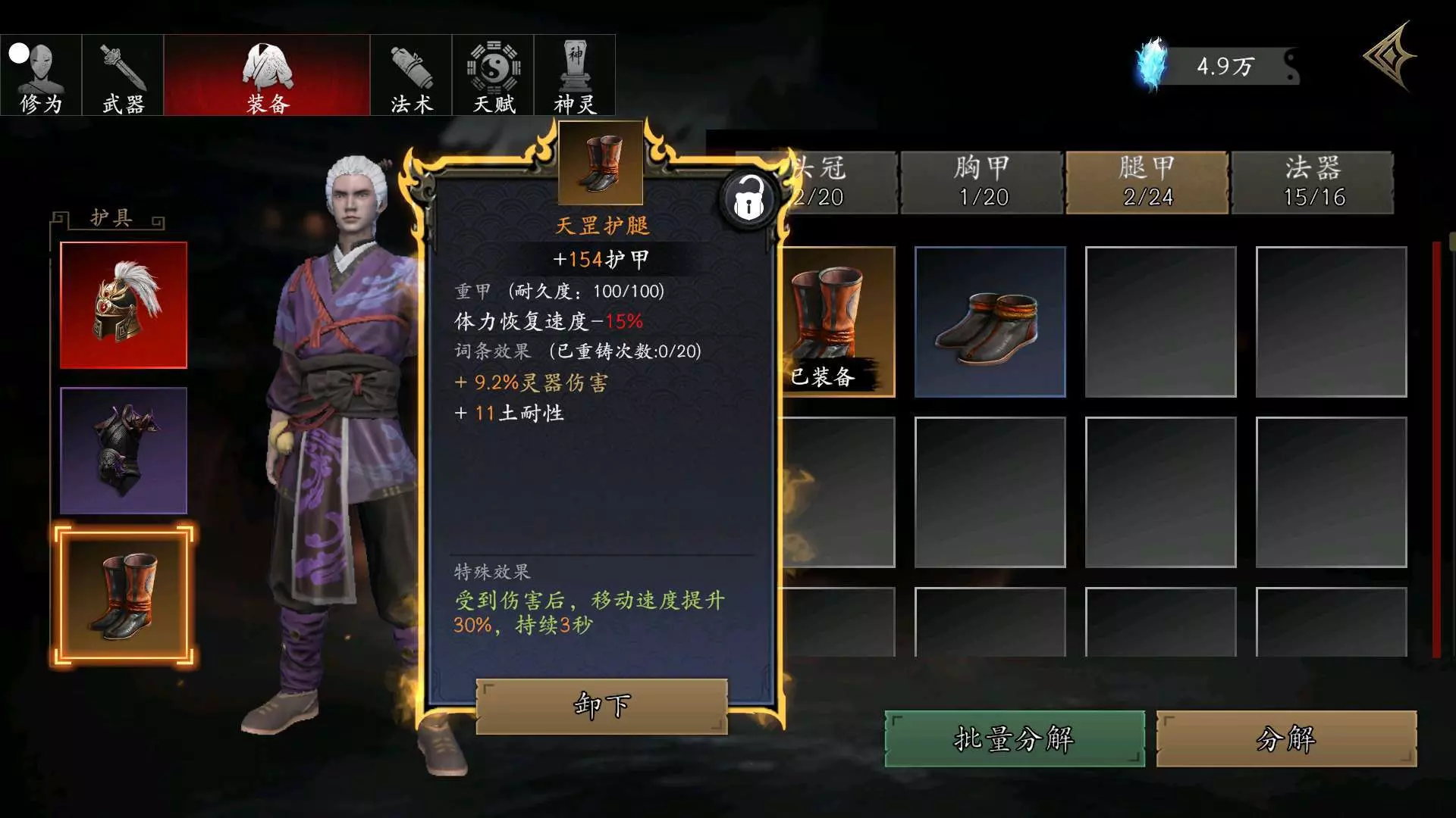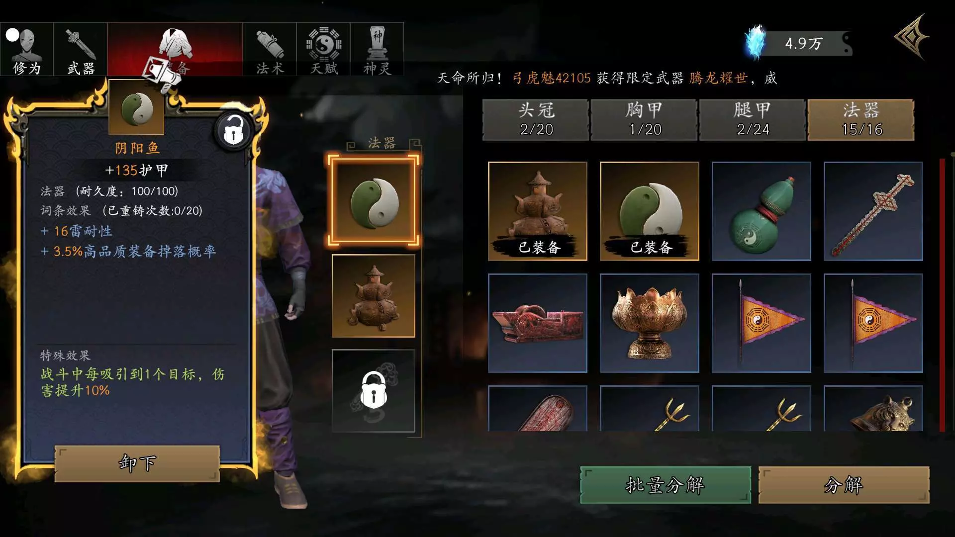 #捕盗行纪 破军头盔是390通宝买的,幽冥胸甲是BOSS掉的,天罡护腿、阴阳鱼、紫虚炉都是100通宝买的