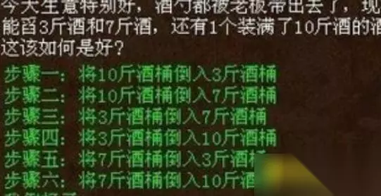 1.在游戏中,倒酒方式一共有两种。第一种是酒家能舀3斤酒和7斤酒,还有1个装满了10斤酒的酒桶,操作步骤一共六步,具体的操作步骤如下图所示。