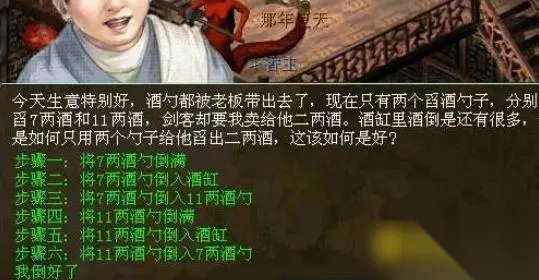 2.第二种是酒家有两个能舀7两酒和11两酒的勺子,剑客却要买二两酒,操作步骤一共六步,具体的操作步骤如下图所示。