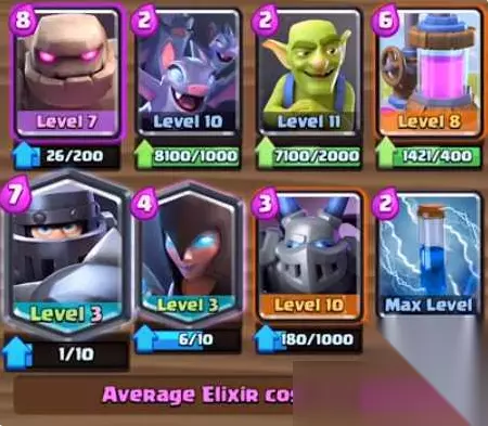 这是一套超级骑士搭配毒矿流玩法的卡组,一眼看上去卡组内全是传奇卡,其实这里面很多卡牌都是可以用其它普通卡替换的,比如地狱飞龙可以用地狱塔替换,闪电法师可以使用弓箭手之类的替换,如果幻影刺客卡牌尽量不要替换,因为这张卡比较特殊,可以用来化解很多卡牌。 超级骑士卡组3、超级骑士哥布林飞桶组合