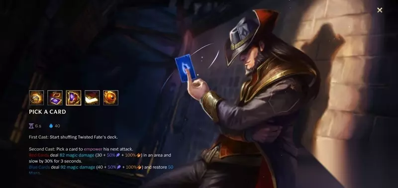 W技能:选牌 这是卡牌大师的核心技能,使用后会进入切牌状态。卡牌会按照红牌、黄牌、蓝牌的固定顺序循环切换。红牌造成范围伤害和减速效果,黄牌提供单体眩晕控制,蓝牌则能回复法力值并造成最高单体伤害。