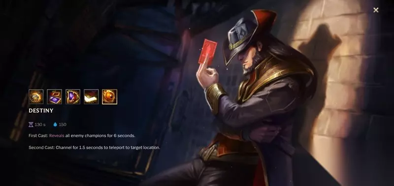 R技能:命运 卡牌大师开启全图视野,短暂延迟后可以传送到地图任意位置。这个技能让卡牌拥有极强的支援和分推能力,是带动游戏节奏的关键技能。