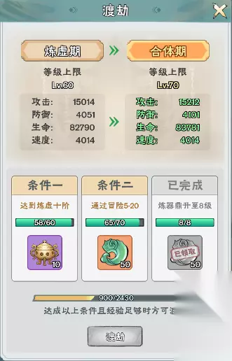 渡劫: 每当道友完成渡劫任务并获得足够的经验即可进行渡劫,提高角色属性,还会改变角色外貌;
