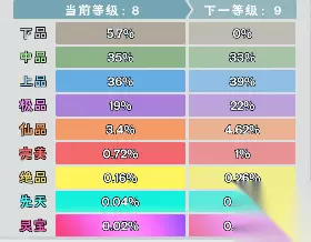 品级介绍: 品级一共分为8种不同品质的装备,通过升级神鼎来提高高品质的装备得到率,以下由低到高依次排列: 下品、中品、上品、极品、仙品、完美、绝品、先天、灵宝