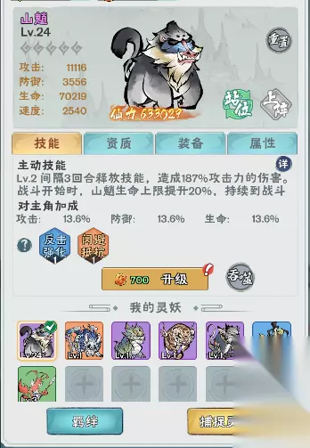 灵妖: 灵妖可以协助角色战斗,在战斗中释放参战技能,可以通过降伏获取灵妖,降伏灵妖时随机获取灵妖被动技能。消耗妖丹 可以提升灵妖等级。 通过吞噬同名灵妖,可以提升灵妖被动技能,被动技能最多获取四个,如果已有四个技能则升级现有被动技能。 可消耗仙缘重置灵妖等级。重置将返还所有升级材料,吞噬等级和被动技能不会发生变化。已降伏灵妖可放生,将返还其80%升级材料。 灵妖达到等级五十以及吞噬五级之后解锁洗练功能,允许消耗材料重新随机灵妖的被动技能;重新随机时灵妖的被动技能总等级不变。