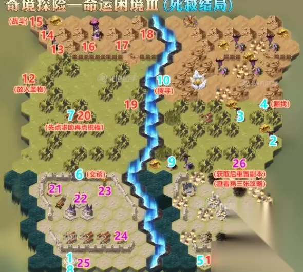 1.到1的位置,进入传送门后,前往2.3的位置,消灭怪物阵营 2.到4的位置,点击翻找获取通行证后,前往5的位置,进入传送门 3.到6的位置,与卫兵交谈开门后,前往7的位置,向老头求助,获取祝福 4.到8的位置,进入传送门后,前往9的位置,消灭沿途怪物阵营 5.到10的位置,搜寻物品后,前往11的位置,进入传送门 6.到12的位置,放入圣物,然后消灭13.14的怪物阵营 7.到15的位置,点击战斗,消灭出现的小怪 8.到16.17.18.19.20.21.22.23.24的位置,点击战斗,消灭出现的小怪 9.到25的位置,进入传送门 10.到26的位置,获取大奖励后,重置副本 三、普通结局