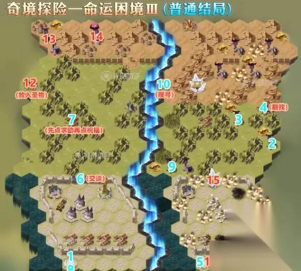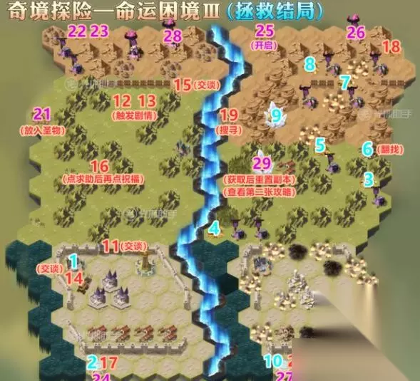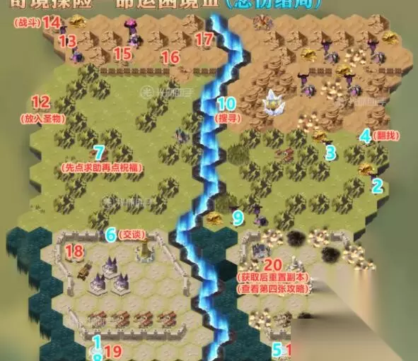 1.到1的位置,进入传送门后,前往2.3的位置,消灭怪物阵营 2.到4的位置,点击翻找获取通行证后,前往5的位置,进入传送门 3.到6的位置,与卫兵交谈开门后,前往7的位置,向老头求助,获取祝福 4.到8的位置,进入传送门后,前往9的位置,消灭沿途怪物阵营 5.到10的位置,搜寻物品后,前往11的位置,进入传送门 6.到12的位置,放入圣物,然后前往13的位置,消灭沿途怪物阵营 7.到14的位置,点击战斗,消灭出现的小怪 8.到15.16.17的位置,点击战斗,消灭出现的小怪 9.到18的位置,点击触发剧情后,消灭出现的小怪 10.到19的位置,进入传送门 11.到20的位置,获取大奖励后,重置副本 四、悲伤结局