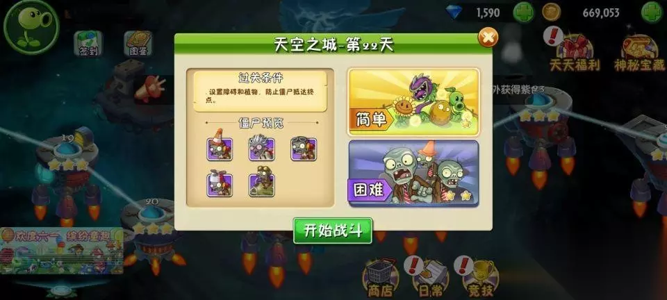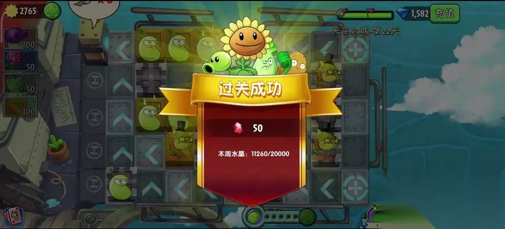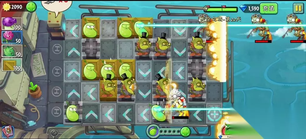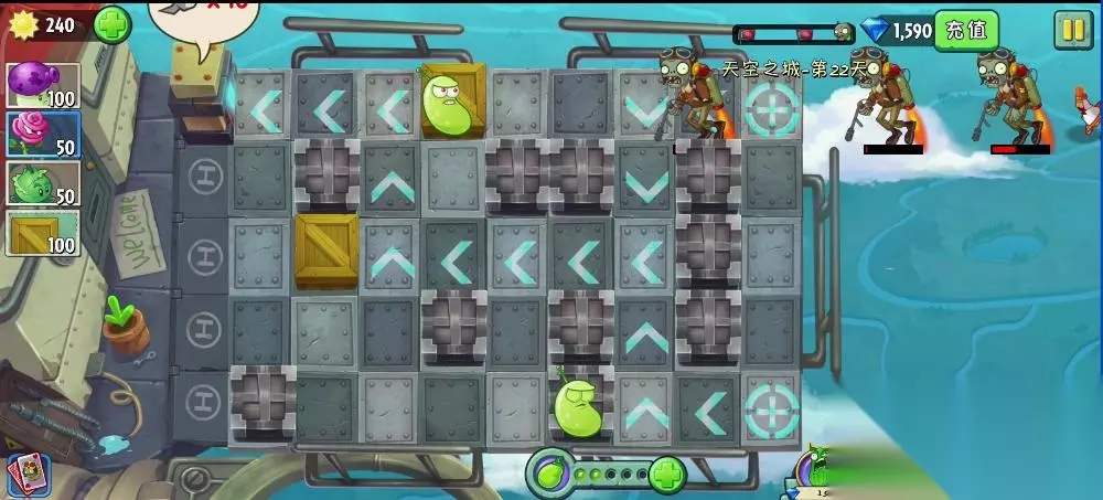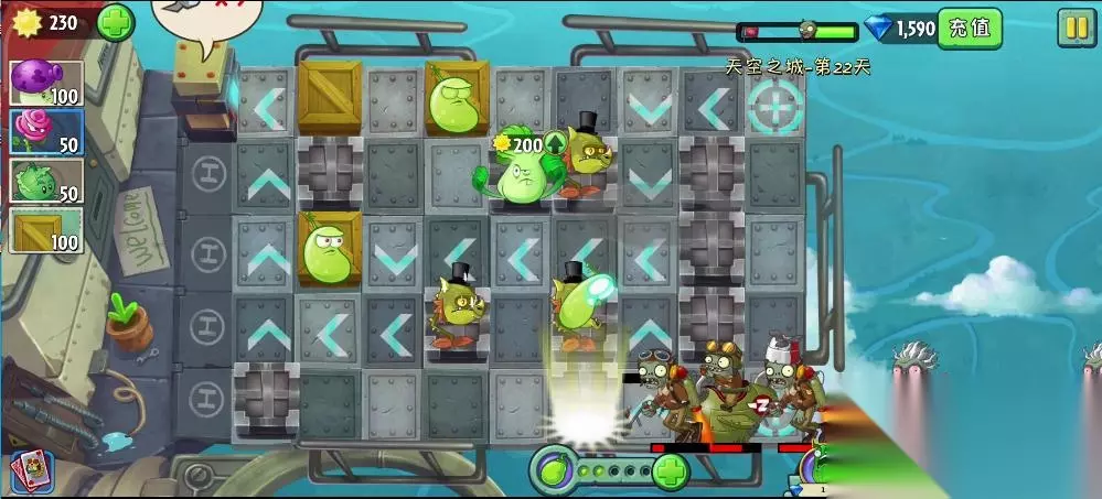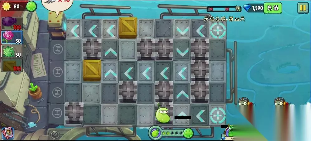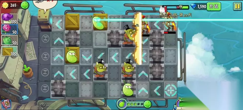 植物大战僵尸2天空之城第22关的过法:先使用木箱堵住几个地方,然后在其他位置放上攻击型植物,在僵尸两边进来的地方都放一个大喷菇,升级成激光豆,把玫瑰剑客升级成火龙草,到处种植,此时可适当增加木箱延缓僵尸攻击的路线,当战斗机僵尸出现,就使用能量豆在激光豆身上,成功击杀,到了后期只要有可以种植植物的地方,就种植玫瑰剑客升级成火龙草,大喷菇升级成激光豆,既可成功过关。 1、第22关的过关条件是设置障碍和植物,防止僵户抵达终点。