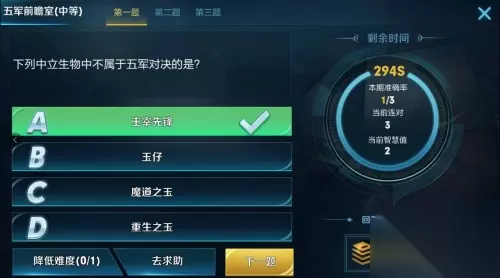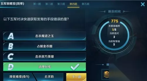 在五军对决模式中,其实是没有主宰先锋的。。。。。 王者荣耀王者知道五军前瞻室简单难度题目答案: 王者荣耀五军前瞻室简单难度题目第四题正确答案: 以下五军对决快速获取发育的手段错误的是: 正确答案:D 清理并线